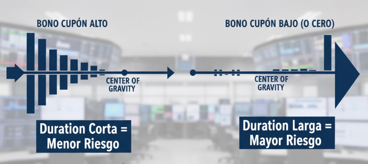 Aunque se mide en años, no es el tiempo hasta el vencimiento. Piénsalo como el "centro de gravedad" de los pagos del bono. Es el punto de equilibrio en el tiempo en el que un inversor recupera el valor presente de su inversión. Un bono con cupones altos pagará más dinero al principio, por lo que su "centro de gravedad" (y su duración) será más corto.